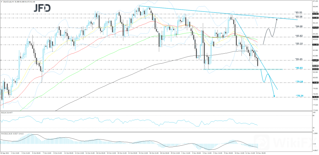 Taking look at the technical picture of Brent crude oil on the 4-hour chart, it can be observed that currently the commodity is trading below a steep short-term downside resistance line taken from the high of November 10th. The price is also near the 80.83 hurdle, which is the current lowest point of November. Even though Brent oil is showing willingness to move lower, as suggested preferably needs to wait for a break below that hurdle first, in order to get comfortable with lower areas after some Hours.